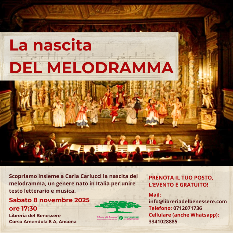 ?? Come nasce il melodramma? Cosa unisce opera seria e opera buffa?   ?? Scopri un genere nato in Italia per unire testo letterario e musica, in una serie di incontri con Carla Carlucci alla Libreria del Benessere!   ?? Il primo appuntamento è dedicato alla nascita del melodramma: se ami teatro e musica e vuoi conoscere le sue origini, non puoi mancare!   ?? Nei prossimi incontri ci ...