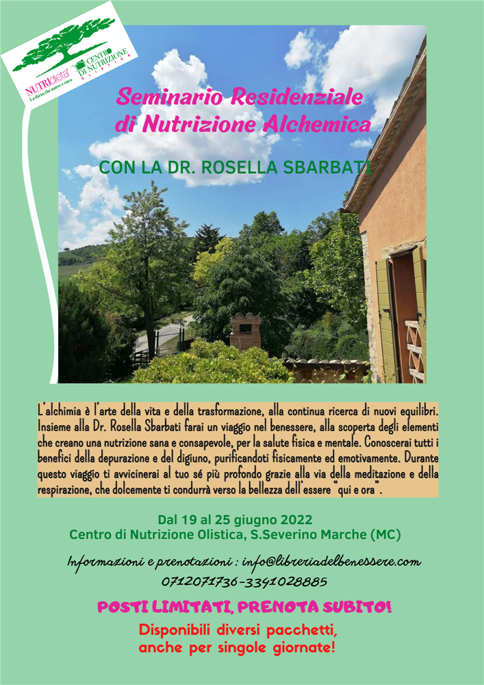 L’alchimia è l’arte della vita e della trasformazione, alla continua ricerca di nuovi equilibri. Insieme alla Dr. Rosella Sbarbati farai un viaggio nel benessere, alla scoperta degli elementi che creano una nutrizione sana e consapevole, che doni salute fisica e mentale. Imparerai a fare una spesa sostenibile, a cucinare piatti semplici e gustosi secondo il metodo NUTRIdieta. Il Centro di Nutrizione Olistica, che ospiterà l’evento, sarà il laboratorio alchemico in cui scoprirai come cibo ed emozioni creano la tua armonia. Conoscerai tutti i benefici della depurazione e del digiuno, purificandoti fisicamente ed emotivamente. Durante questo viaggio ti avvicinerai al tuo sé più profondo grazie alla via della meditazione e della respirazione, che dolcemente ti condurrà verso la bellezza dell’essere “qui e ora”.