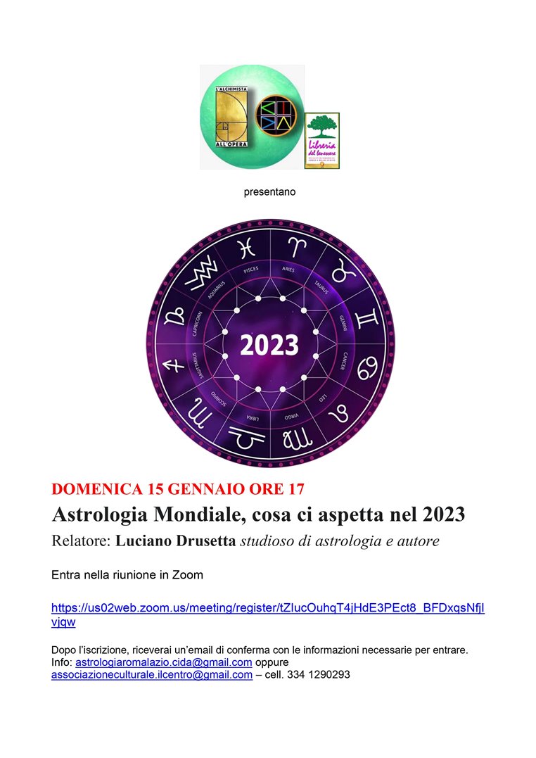 Domenica 15 gennaio 2023, ore 17 "Astrologia mondiale, cosa ci aspetta nel 2023" Relatore: Luciano Drusetta, studioso di astrologia e autore Link di iscrizione: https://us02web.zoom.us/meeting/register/tZIucOuhqT4jHdE3PEct8_BFDxqsNfjIvjqw