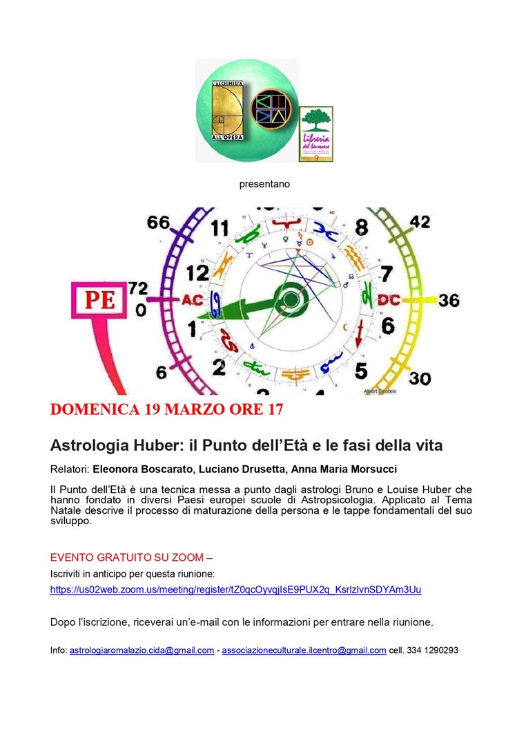 DOMENICA 19 MARZO ORE 17 Astrologia Huber: il Punto dell’Età e le fasi della vita Relatori: Eleonora Boscarato, Luciano Drusetta, Anna Maria Morsucci Il Punto dell’Età è una tecnica messa a punto dagli astrologi Bruno e Louise Huber che hanno fondato in diversi Paesi europei scuole di Astropsicologia. Applicato al Tema Natale descrive il processo di maturazione della persona e le tappe ...