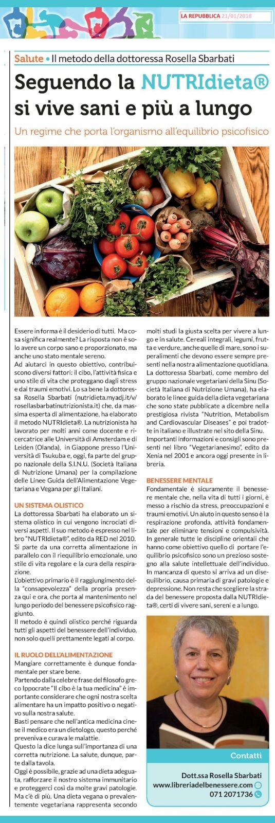 Sul quotidiano "La Repubblica" è presente un'intervista alla Dottoressa Sbarbati dal titolo "Seguendo la NUTRIdieta si vive sani e più a lungo".