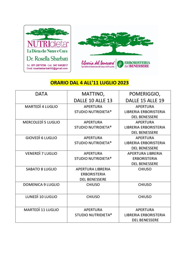 Da martedì 4 luglio a martedì 11 luglio ci sarà un cambiamento nel nostro orario di apertura. La Libreria Erboristeria del Benessere sarà aperta i pomeriggi di martedì, mercoledì, giovedì e venerdì dalle 15 alle 19, e la mattina di sabato dalle 10 alle 13. Lo Studio NUTRIdieta® sarà aperto le mattine di martedì, mercoledì, giovedì e venerdì dalle 10 alle 13.