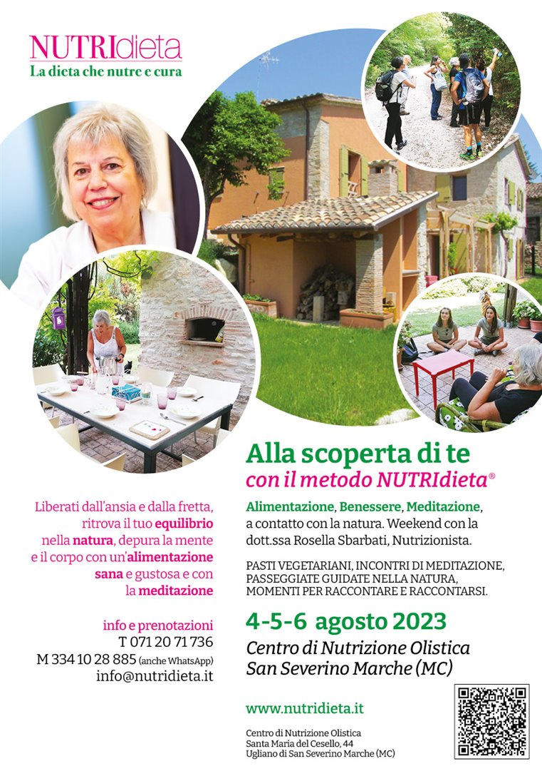 Torna anche quest’anno l’evento con formula weekend che ti permette di ritrovare il tuo equilibrio, liberandoti dall’ansia e dallo stress, attraverso un soggiorno immerso nella natura delle colline marchigiane, con una sana e gustosa alimentazione vegetariana, incontri di meditazione, passeggiate nel bosco e momenti per raccontare e raccontarsi, con la presenza costante della dottoressa Rosella Sbarbati, Nutrizionista olistica.