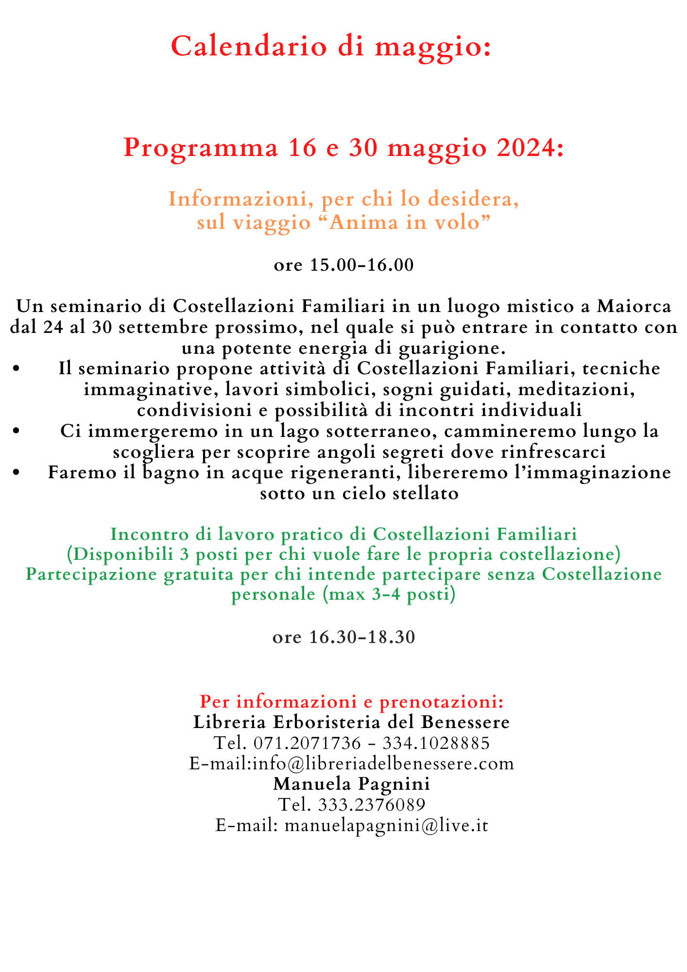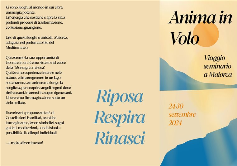 Ci sarà la possibilità di scoprire tutti i dettagli del bellissimo viaggio "Anima in Volo", un seminario in un luogo mistico a Maiorca.